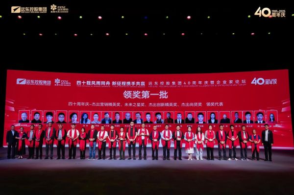 蔣錫培,集團聯合創始人、遠東慈善基金會理事長陳曉芬為四十周年慶杰出客戶官獎、四十周年慶忠誠獎、四十周年慶國匠獎、四十周年慶杰出共產黨員獎、四十周年慶杰出管理人物獎、四十周年慶杰出奮斗貢獻獎、四十周年慶國匠獎、四十周年慶政府榮譽獎、四十周年慶安全精英獎、四十周年慶設備精英獎、四十周年慶杰出貢獻獎(個人)、四十周年慶杰出董監高獎代表頒獎。